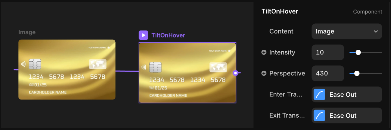 Customize the tilt intensity, perspective depth, and transition animations through the property panel to match your design needs