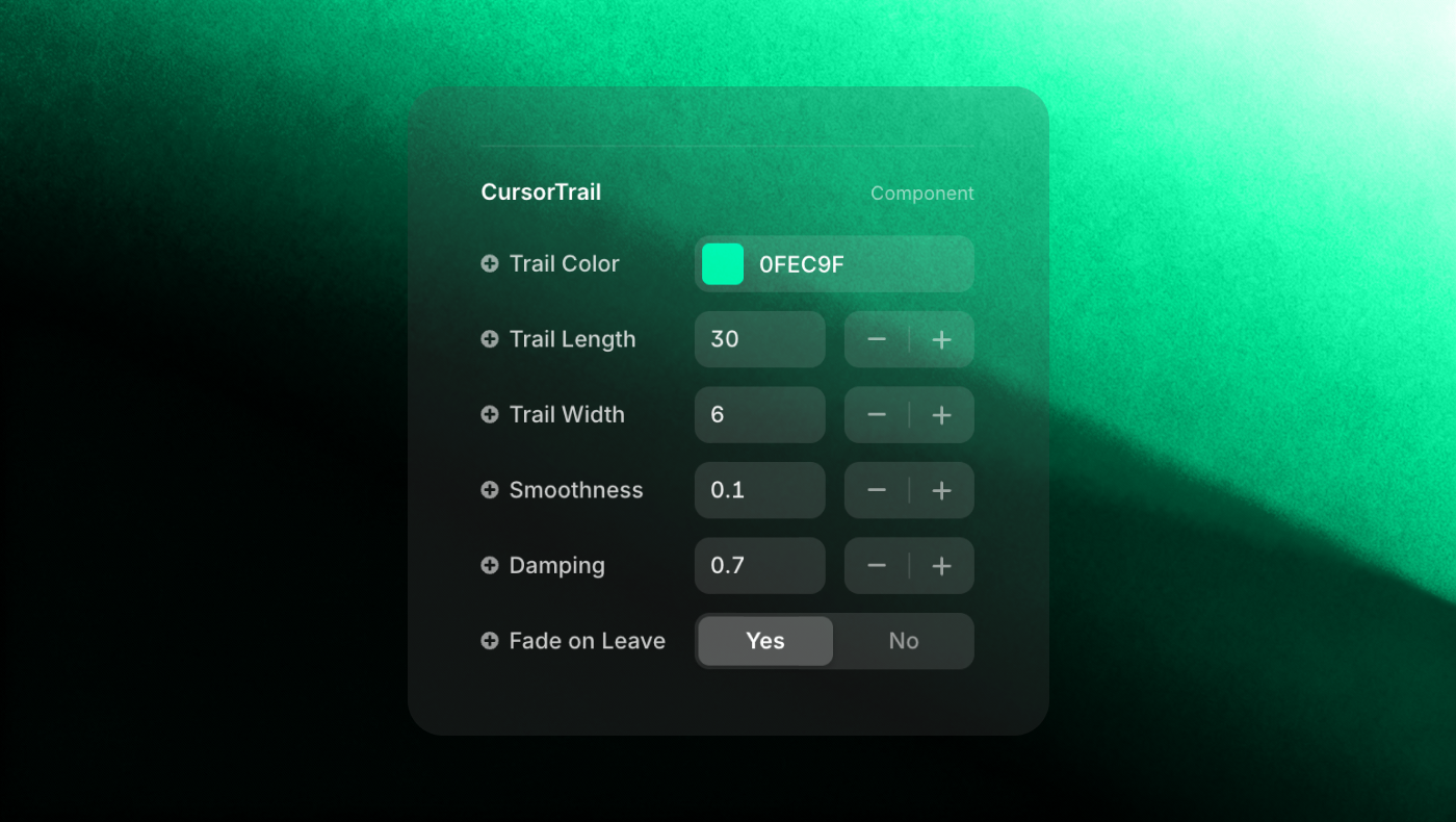 You can customize trail color, length, width, smoothness, and damping to perfectly match your style. It reacts instantly to cursor movement, softens naturally when leaving the screen, and runs on performant canvas rendering for ultra-smooth animation.
