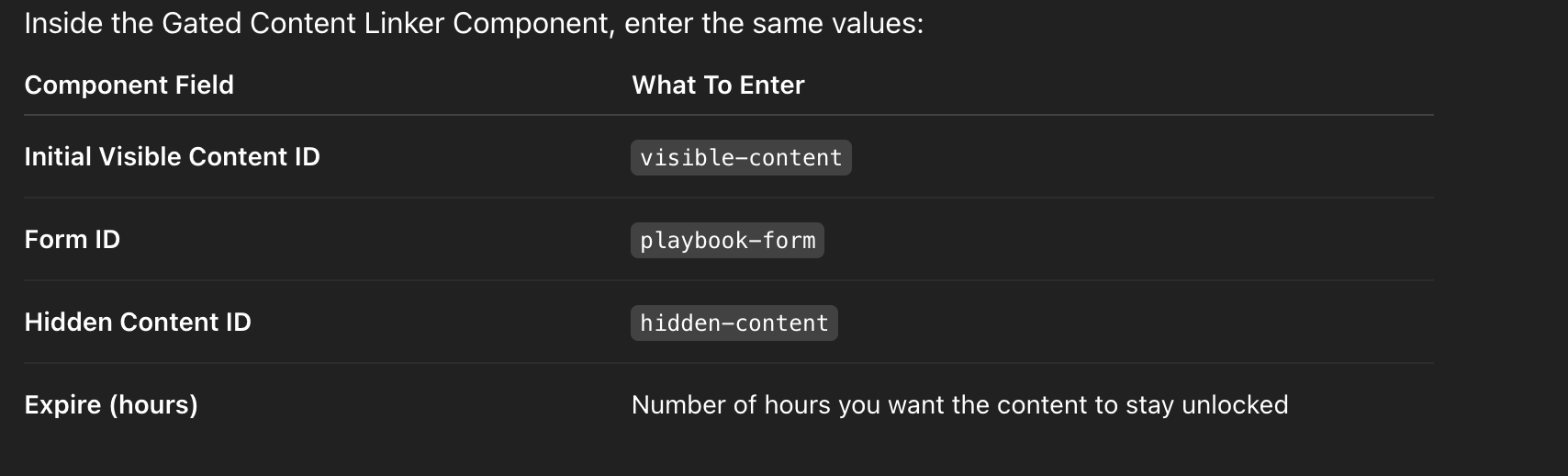 “This component links any existing Framer form to a gated content flow. Assign IDs to the sections you want to hide or reveal using Section Name. After the form is submitted, the component unlocks the hidden content and remembers access for a set duration using local storage.”