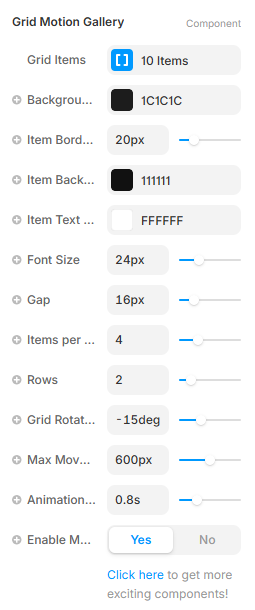 Bring your website visuals to life with the Grid Motion Gallery. This component displays a collection of images in a responsive grid that smoothly scrolls horizontally with mouse movement. Perfect for adding depth, energy, and interactivity to any section of your site