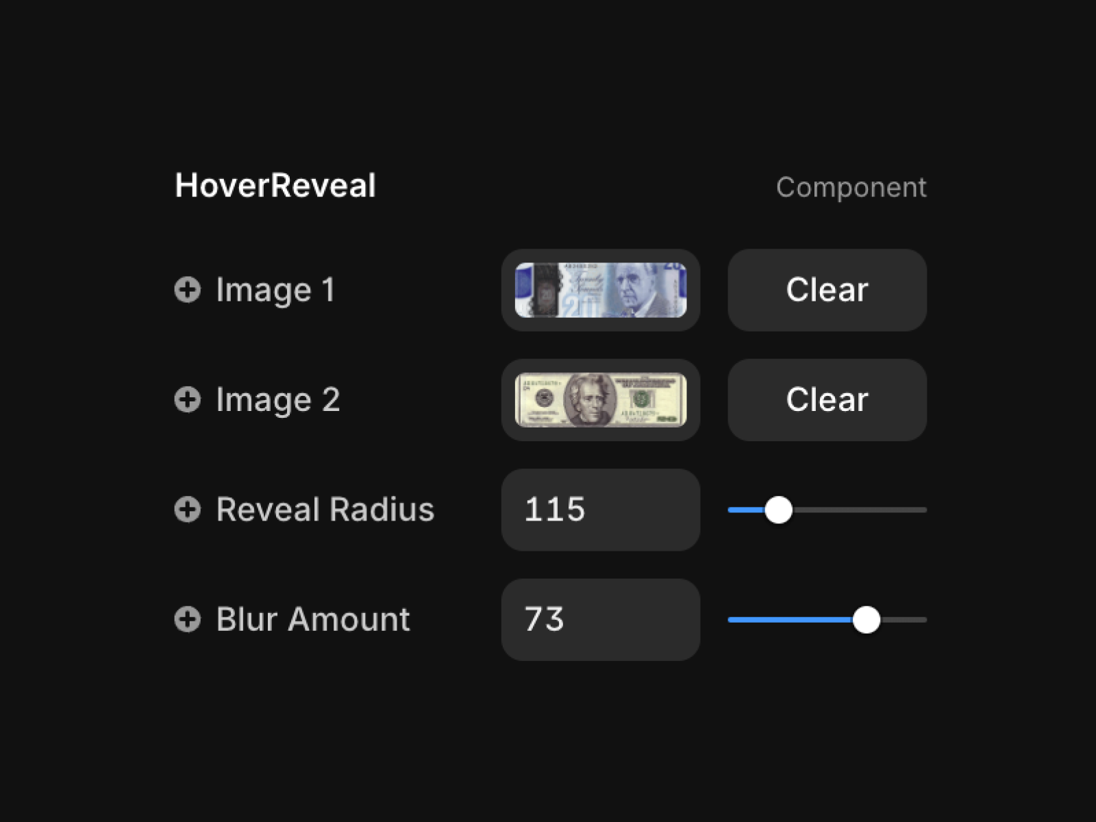 This component creates an interactive image reveal effect for websites. It works with two images: A base image that's always visible and hidden image that's revealed when you hover