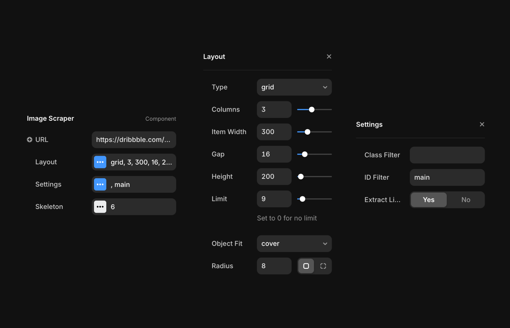 This component automatically extracts and displays all images from any website URL you provide from sites like Dribbble or other image heavy sites like portfolios.