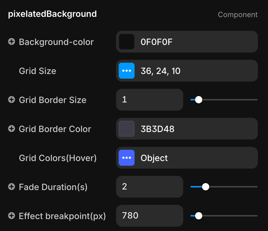 Effect breakpoint (px). – Define the screen width at which the background automatically switches from hover interaction to random flicker, ensuring the effect adapts seamlessly to different devices. Hover interaction is the default.
