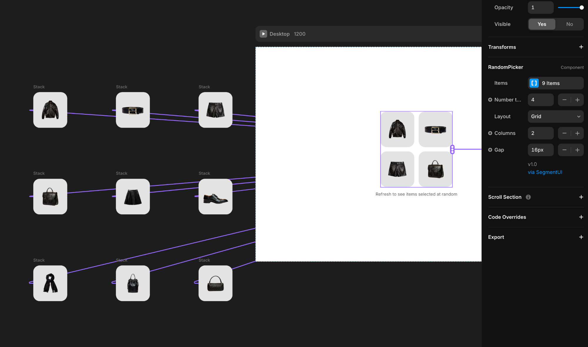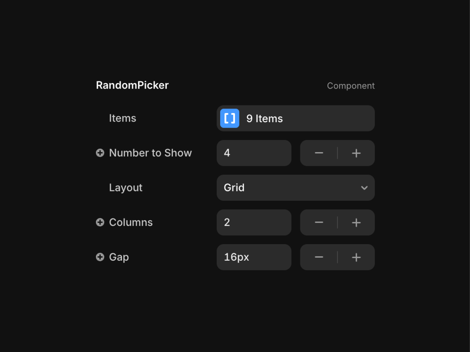 This is a code component that takes multiple component instances and randomly displays a subset of them. Connect all the items you want to randomly choose from using the "Items" array property, then set how many items should appear using "Number to Show." The component includes layout controls to arrange your random items vertically, horizontally, or in a grid format. If you choose grid layout, you can specify the number of columns. The gap property controls spacing between items. Every time someone visits or refreshes the page, different random items from your collection will be displayed.