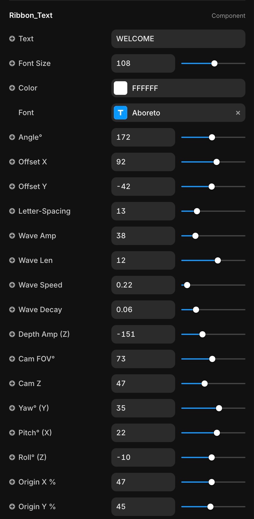 3D Ribbon Text is a Framer component that lays out characters along a dynamic ribbon with sinusoidal motion. It includes a CSS-3D “camera” (FOV, yaw/pitch/roll, Z distance, origin) and per-axis offsets (X/Y) plus depth amplitude for true parallax. Tune tracking, wave amplitude/length/speed/decay, and render crisp, animated headlines that feel spatial without WebGL.