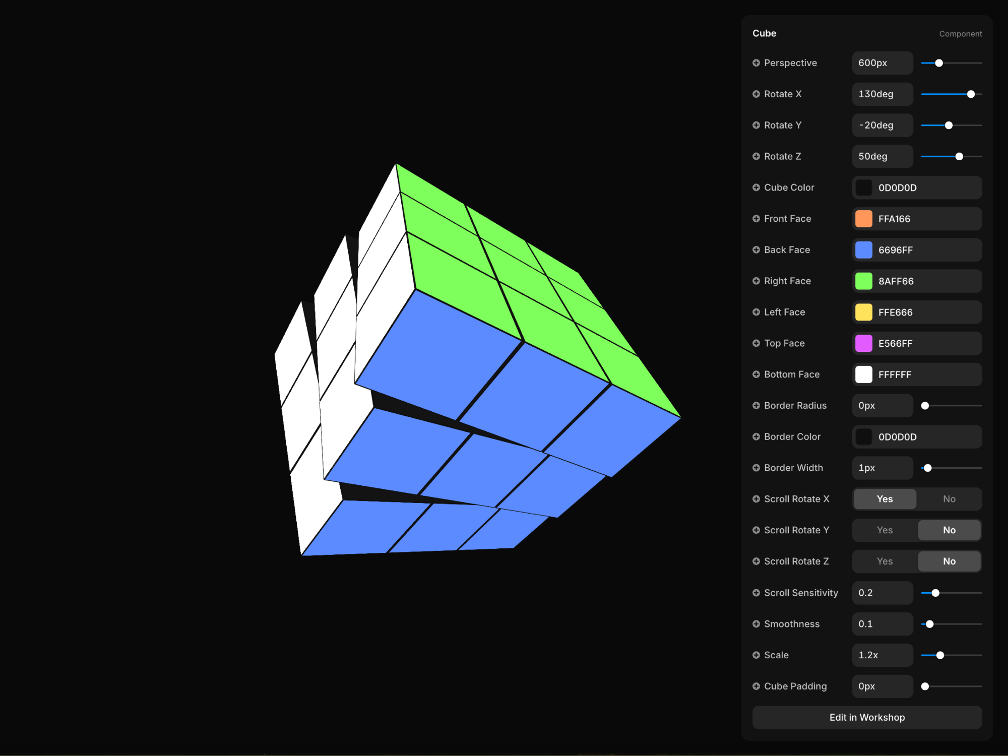 This component is an interactive 3D cube built with the Workshop plugin in Framer. It combines scroll-driven motion with extensive styling controls, making it a versatile and engaging element for modern digital experiences.