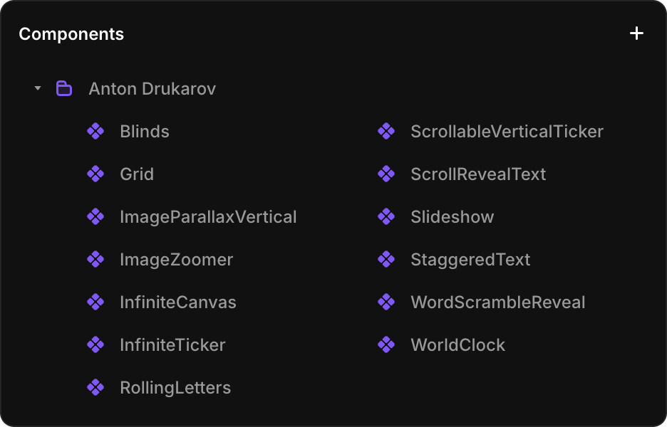 13 custom-made components and 2 code overrides that help Möbius® stand out. Each component adds something extra to the experience, extending what Framer can do out of the box.