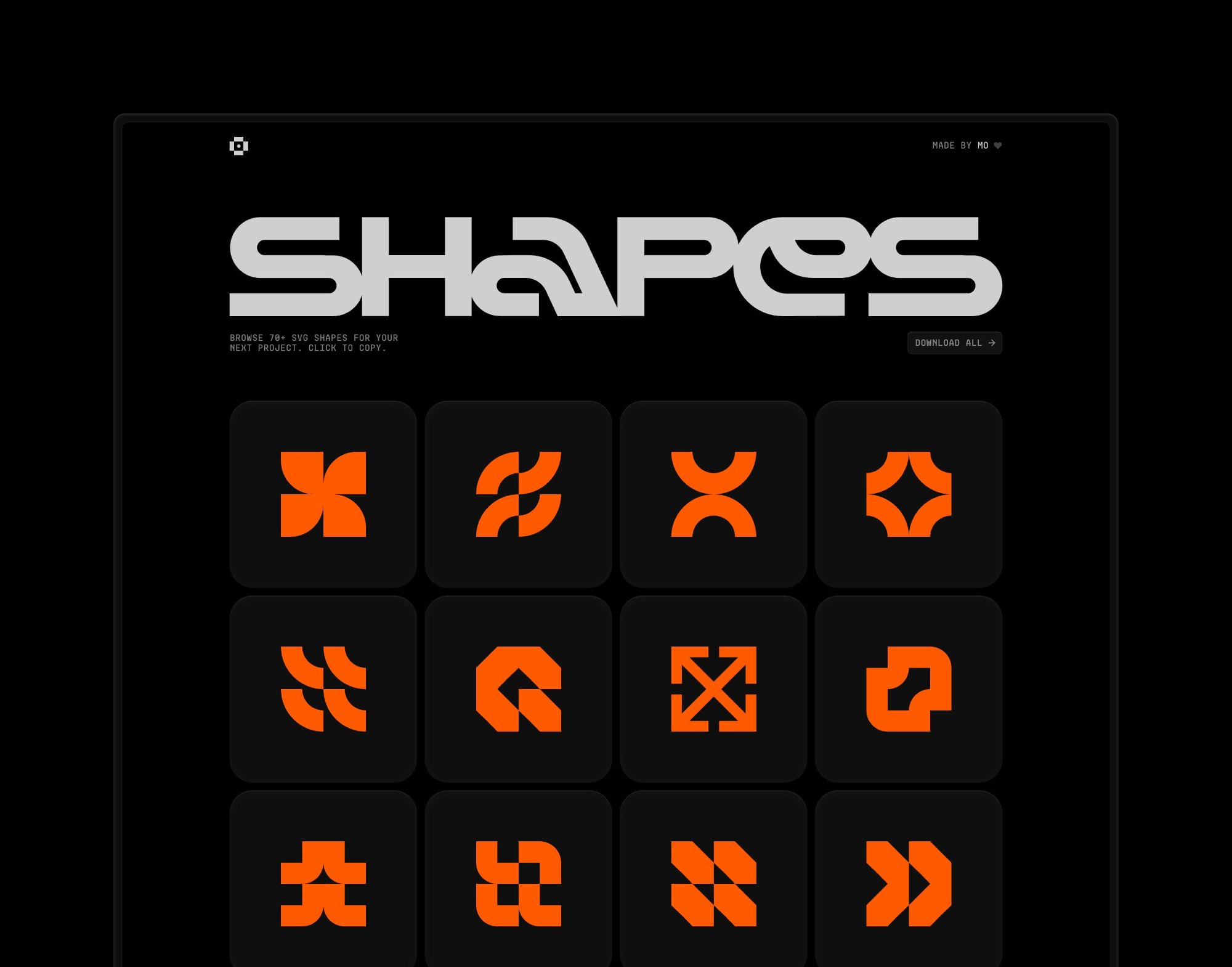 This vector set includes a collection of geometric shapes designed on an 8px grid. The forms are clean, abstract, and bold, reflecting a brutalist visual style. The set was adapted from shapes.gallery.